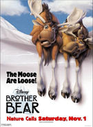 Disney animated film set in the Pacific Northwest before Europeans came to the Americas. An undisciplined young man seeking revenge kills the mother bear he blames for his brother's death. In a supernatural twist, he becomes a bear himself, befriends bears and other forest animals and learns that who's a monster and who isn't is often a matter of perspective. With the voices of Joaquin Phoenix, Rick Moranis, Jeremy Suarez, Dave Thomas and Joan Copeland. Directed by Aaron Blaise & Bob Walker. [1:25]