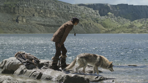 ► A teen boy finds a wolf lying on the ground with a long red gash on one front shoulder and tries to stab it with a spear but cannot do it; the wolf snarls at him when he gives it water, and he later ties its mouth shut with a leather strip, it whines and the boy carries it to a river and washes its wound as hyenas chatter nearby, and the boy takes the wolf to a cave, places some maggots on the wound and he and the wolf eat other maggots. A young man carries an injured wolf until he reaches his small home encampment and he and the wolf collapse in the center of the village; a man and a woman bring them into a tent where a female shaman lays hands on the wolf, looks at its moving back legs, reaches below the frame and raises up a wolf pup with slightly wet fur, followed by another pup (we later see five pups).