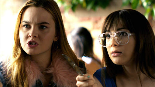 ► A teen girl asks a teen boy, “Are you here to murder me?” A teen girl writes a threatening text that she does not send. A teen boy and a teen girl argue in several scenes before breaking up. A teen girl says that she doesn’t want to eat anything that needs to be “corned” (referring to corned beef). A teen girl tells a patron at a movie theater that she will not sell him a hot dog because the smell of the “pig parts” will ruin the cinematic experience for the others. A teen girl is reprimanded by her boss for not selling items to the customers. A teen girl yells at a teen boy when she thinks he told her ex-boyfriend to date another teen girl. A teen girl says that meeting another teen girl (her ex-boyfriend’s new girlfriend) was “less bloody than I thought.” A teen girl jokingly tells another teen girl that she should wear a jacket made of her skin so that she won’t miss her when she goes away.