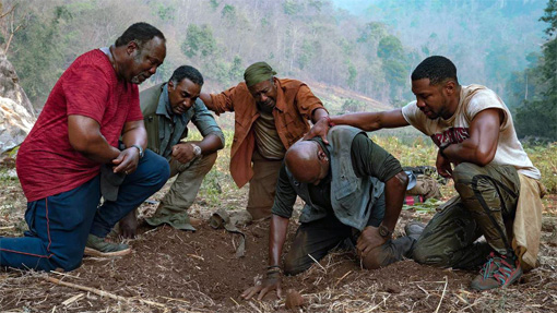 Four Vietnam veterans (Delroy Lindo, Jonathan Majors, Clarke Peters and Norm Lewis) return to the war-torn country to find the remains of their deceased squad leader (Chadwick Boseman), as well as dig up a cache of buried Vietnamese gold. They then have to fight locals and each other for its possession. Also with Isiah Whitlock Jr., Melanie Thierr, Paul Walter Hauser, Jasper Pääkkönen and Jean Reno. Directed by Spike Lee. [Running Time: 2:35]