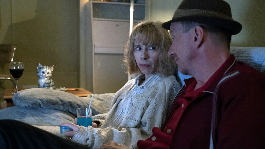 ► A woman visits her sick mother, and she asks another woman, “Is she dead yet?” A woman tells her nephew that she is actually his mother. A woman hears a voice on a radio talking about committing suicide. A woman tells another woman that her own husband is dead. A woman asks another woman what it’s like to be schizophrenic and what happens when she is off her meds; the woman describes seeing spiders on the walls and makes clicking noises like they are skittering on her face and into her mouth, and she describes shaking when she hasn’t taken her medication. A woman imitates having medication withdrawal and symptoms of schizophrenia when a social worker comes to interview her for benefits. A woman tells a teen girl to step away from the wall because the people in the walls with drag her in. We hear that a boy’s dog died and the child is very sad. A woman arrives at her parents’ home on Christmas day and informs them that she has brought her own gifts and that they’ll need to reimburse her for what she spent on them; everyone seems confused and her sister refuses to pay her. A woman tells her daughter that she is very sick and “it’s really bad,” but not to tell her sister. A woman takes the hand of her adult daughter and a man and closes her eyes, and then opens them and proclaims that the man “has the devil in him.” A woman peels wallpaper off walls and opens a hole in the wall that when she looks through she sees herself as a teenager peeling paper off the walls.