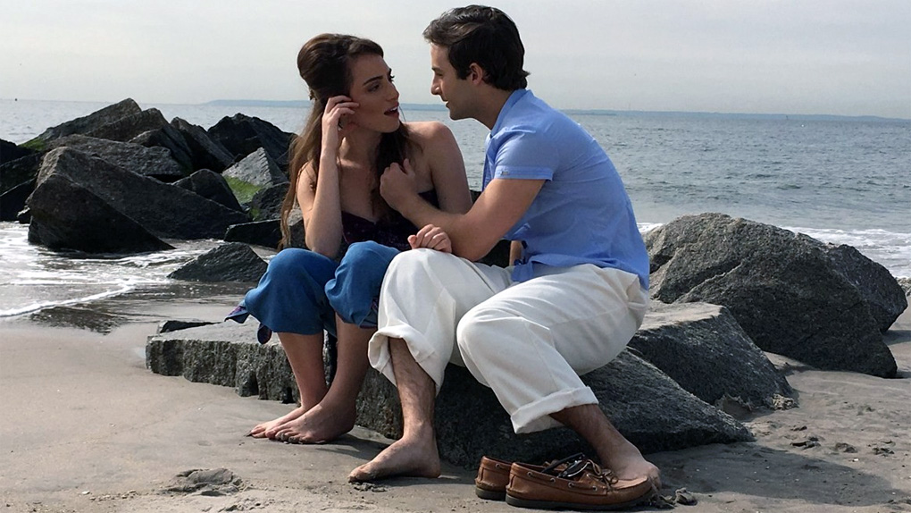 ► A young man and a young woman dance at a bar, they move closer to each other, he caresses her arm and they kiss. A woman sits on a bed with a young man and she touches his arm tenderly until the young man’s mother tells the woman to help her in the kitchen. A young man and a young woman kiss on a beach, two women kiss, and a woman kisses another woman on the forehead. A woman hugs a man, and a young woman hugs a young man.