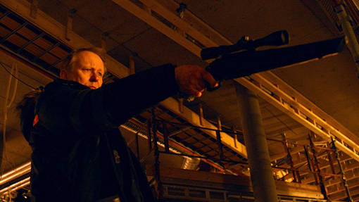 ► A man holds a gun to another man's face, a bag is placed over his head and he is shoved into the back of a car where another man with a badly bloody and bruised face is shown bound and struggling to get free as the other man is forcibly injected with a drug. A man jumps out of a moving car, slowly gets off the ground and runs through deep snow as a man from the car shoots at him several times (he presumably misses because the shooter yells and throws his gun down in frustration). A man with a gun hides under a truck and another man holds a gun to his head. A man with a gun climbs into a moving snowplow and threatens the driver.