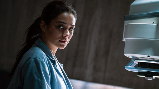 ► A woman sitting on a toilet in a washroom hears the hand dryer operate, looks under the stall door and sees a bloody disembodied hand grab a rubber ball from the floor and move off-screen with it; she yells in alarm. A woman pulls a corpse out of a drawer and it moves one arm slightly and exhales a loud breath, startling her. A woman hears voices and thuds off-screen and panics, hyperventilating. A woman sees a corpse on a hall floor in surveillance footage and gasps in alarm. A woman punches a heavy hanging bag furiously in two scenes.