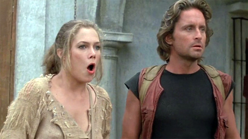 Romantic comedy and adventure about a successful romance writer (Kathleen Turner) whose real life is devoid of both passion and danger. Everything changes when her sister is kidnapped in Columbia and she ends up embroiled with a charming rogue (Michael Douglas) looking for treasure while avoiding a homicidal paramilitary official. Also with Danny DeVito, Zack Norman, Alfonso Arau, Manuel Ojeda, Holland Taylor and Mary Ellen Trainor. Directed by Robert Zemeckis. A few lines of dialogue are spoken in Spanish without translation. [Running Time: 1:46]