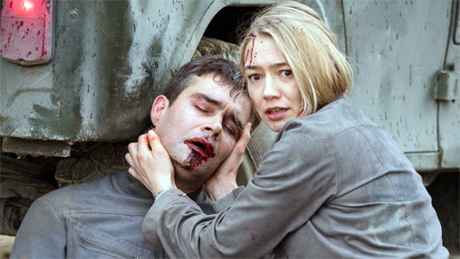 ► A man shoots at a creature and we see the man later with part of his arm missing as he ties a tourniquet around it to stop the bleeding. A man breaks into another man’s office and confronts him about what he was doing; he shoots the man off-screen. A man shoots himself in the chest (we see blood splattered behind him and pooling on the ground). Men with guns open fire on a man and a woman, and the woman seems to have been struck in the shoulder (we see some blood). A woman drives a vehicle as armed guards shoot at her. A woman threatens a man with a gun as he walks toward her; he grabs her arm and squeezes where she has a bullet wound. A man vomits blood (we see goo) and appears to be getting weak. A woman injects a man in the neck with a sedative and he falls to the floor. A man seems to be getting weak and sick and we see his skin turning gray.