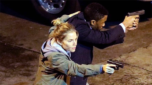 ► Police cruisers chase a man on foot and officers shoot at him; the man slams into the side of a bus, gets up and runs into a police cruiser (he has a few bloody cuts on his face), a man chases him through a dark restaurant kitchen, with a lot of loud glass breakage, and clanging metal ware; the first man shoots out a glass window that shatters over the floor, jumps to the street, and the other man follows as cars swerve to avoid the men running from sidewalk to pavement and back again and a helicopter occupant shoots at the first man, missing.