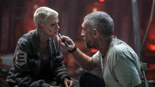 ► Four people walk through darkness outside an underwater station and they see something moving around them: a man is grabbed and taken into a cave, another man retrieves him and goes back in for a gun but is attacked by a creature and he’s pulled away along with a woman attached to him by a cable; they crash into a structure, the man gets caught in cables and the creature attacks the woman trying to eat her helmet until the man stabs the creature but it takes them both deeper as their suits warn that the pressure is too great; the man lets go of the woman, we see his visor crack, his suit implodes and a large shockwave moves through the water throwing the woman and when she revives a giant octopus lunges toward her (she gets away). Six people wearing diving suits lower out of a station and out to the ocean where one man’s helmet visor begins to crack and when it gives way he is blown out of the area and the other people are thrown (we understand that the man is dead). Two people run through a hallway toward a section in a station that will be closed off when the station begins to break apart, water sprays up through the floor and the safety door is closed before the two people can make it to safety (we understand that they must have died); an explosion throws two other people on the other side of the door and one person revives with a bloody wound on his head. Two people move through the rubble of a station toward escape pod bays and one woman hears a voice; the two people find a man trapped under the rubble and pull him out (he seems unharmed but has blood on his face). Five people in a vessel drop out of control and when they land, they mount their helmets and run outside the vessel; heavy debris falls around them, one man is knocked down by some and his oxygen apparatus is damaged (we see him later coughing and vapor escapes when his helmet is removed). Two women dragging an unconscious man enter a station and one woman’s helmet won’t release so the other woman breaks the visor to allow her to breathe.