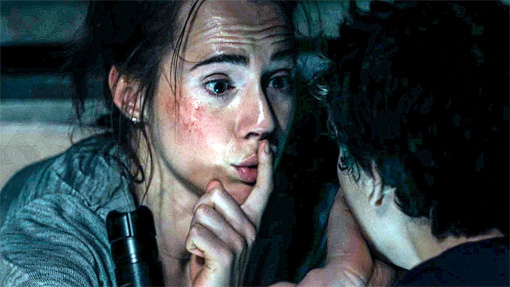 ► A young man hears noises in a house and investigates holding a kitchen knife: he finds a glass door shattered and a man holding a young woman, who has a very bloody face from being beaten; the man pushes the young woman into the blade of the knife held by the young man twice as they yell at each other and the woman falls dead on a bed. A police officer with a gun drawn enters a room yelling for a man to step away from a young man taped into a chair and doused with lighter fluid; the man sets the young man on fire and pushes him toward the officer and the officer shoots the man in the arm as he runs away (we see a bloody wound on the man’s arm), and then tries to put the flames on the young man out with a blanket.