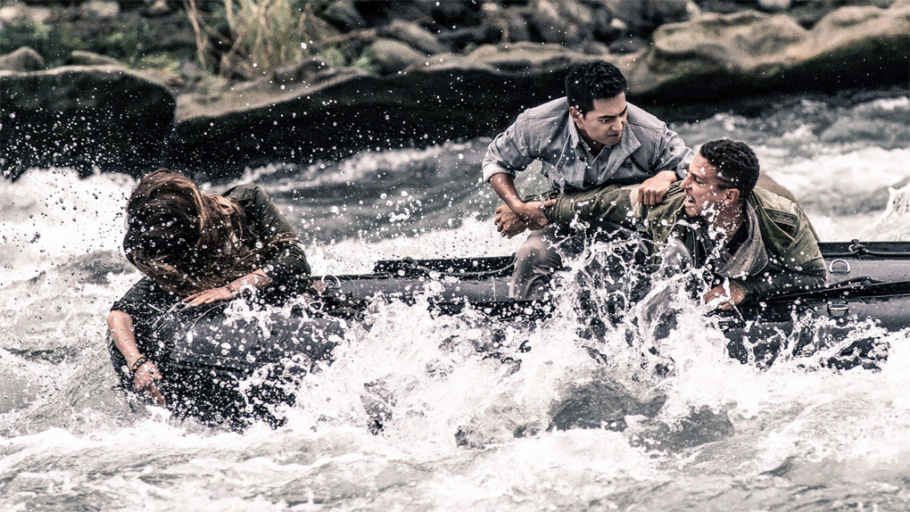 ► A vehicle on water is chased by small boats and skidoos in rapids toward a raging waterfall; several people fight in and between the boats, and many people end up in the water grabbing onto fallen trees and other mounds of dirt and debris; a man in one boat is struck hard by another man and he falls unconscious with a bloody wound on his head, other people are washed over the waterfall and a woman is rescued by a man on a skidoo and they take refuge on a small island before being rescued by a helicopter. A woman riding a motorcycle chases a man driving a car; she leaps onto the car and wraps a strap around the driver’s neck to stop him. A man driving a large vehicle speeds through stopped traffic throwing the other vehicles off the road and flipping one over and the first vehicle crashes through the glass walls of a shopping mall, speeds along the hallways and crashes over a balcony and the men from the car and other men shoot at each other in the mall; one man is shot in the leg and thrown into a large shark tank on display (we see him being circled by sharks as his leg wound bleeds in the water).